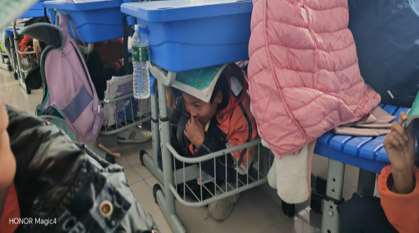 12月20日16点24分,清脆的防震警报拉响,学校安全工作应急预案随即启动,各岗位值班人员迅速到位,各负责老师带领学生先躲在桌子底下10秒后立刻有序地从教室撤离到操场上。各班级清点好学生人数,并及时向安全员贾勇飞同志上报。全校师生和后勤工组人员共1790余人全部安全地撤离到安全区域,用时3分41秒,整个过程有序安全撤离、无拥挤、碰撞和踩踏事故发生。