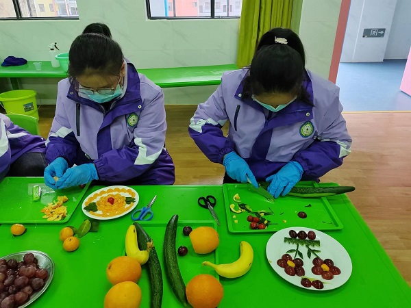 比赛开始,老师们认真对待、动作规范,几乎是完美操作。整理被褥时,老师们一个个从容自如、动作麻利,将凌乱的床铺以最快的速度严格按标准完成,一床床凌乱的被子经过心灵手巧的老师们之手,变得美观整洁、棱角分明;擦桌子时,她们用专用的清洗布将桌子按照顺序进行清洗,精准84消毒液的配比,清洁--消毒-清洁,让细菌无处可逃,将桌子彻底清洗干净,桌面焕然一新;水果削皮厚薄合适,切块大小适中,放置位置开放、合理,摆放出各种精美的造型。