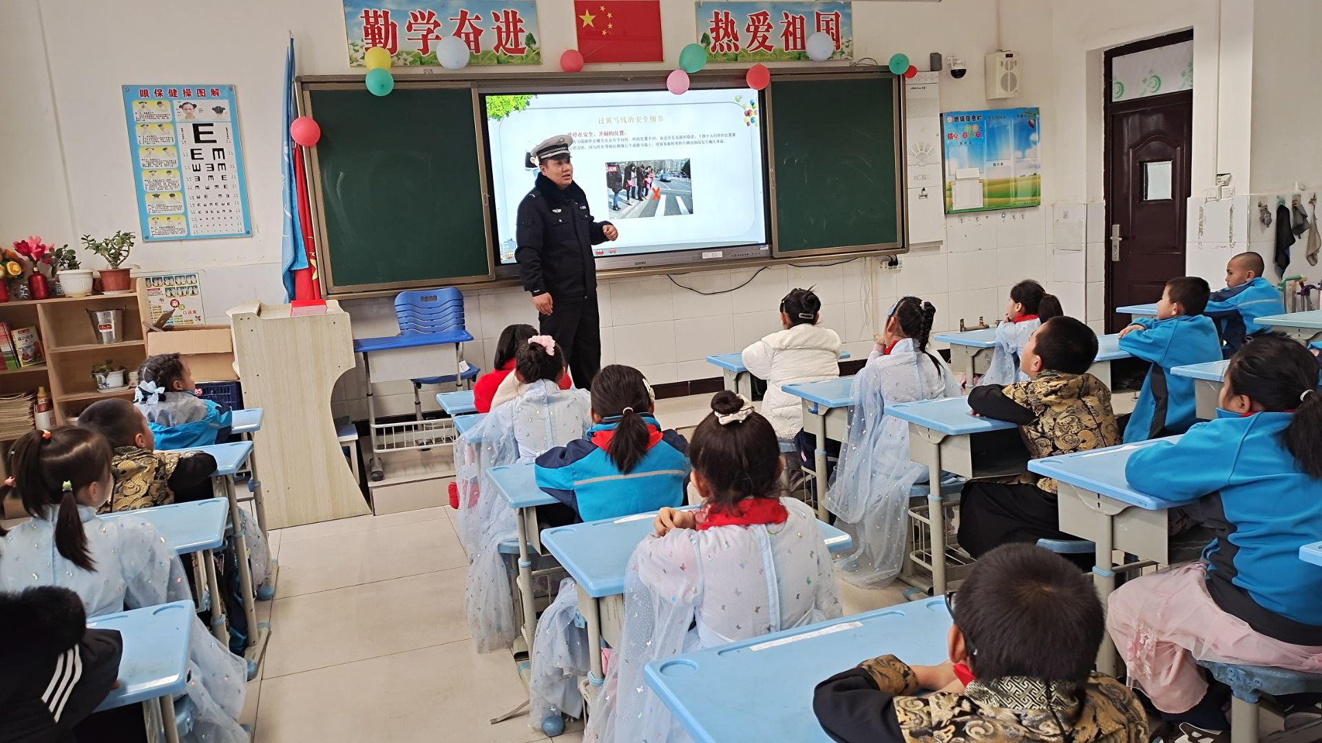 城区中队的警察同志们结合实际,向学生们宣传“一盔一带”的重要性、如何安全过马路以及其他安全出行注意事项,详细讲解了机动车视野盲区,教育同学们要提前避让行驶的车辆、远离大货车等,做到知危险、会避险,引导同学们掌握正确的出行方式,同时,鼓励同学们在课堂上积极提出有关交通安全的问题,并对问题进行了一一解答。最后,交警叮嘱同学们要自觉遵守交通法规,从小养成文明出行的良好习惯。同学们纷纷表示:要积极向家人和身边的人宣传交通安全知识,争做文明交通参与者、传播者。