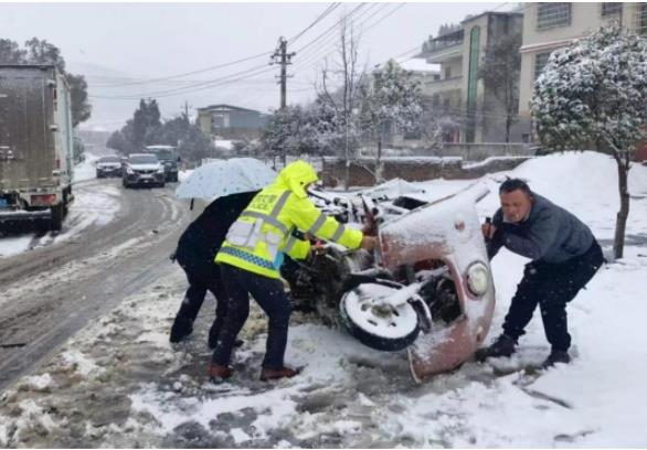 在武冈乡镇道路上,由于雪下的急,气温骤降,路面开始结冰,车辆极易打滑,有几辆车已经无法行驶,导致车辆积压在路上,给人民群众的交通出行带来了极大的不便。正在进行巡查的武冈交警看到这一幕,第一时间带领民辅警投入救援,帮助驾驶员推车,周围的车主群众也一齐发力,让被困车辆驶离危险地带,并嘱咐他们缓慢行驶,尽早回家。被困车主对巡逻民警的帮助纷纷表示感谢:“没有你们的帮助我们可能就被困在路上了,不但自己的安全得不到保障,还影响了其他人的通行,感谢你们的保驾护航。”
