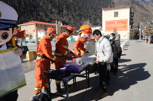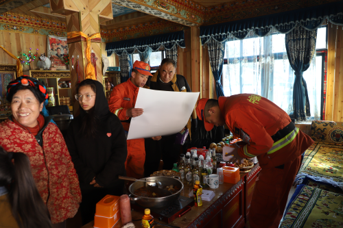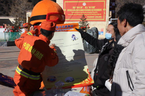 “扎西德勒、新年快乐,阿嬷,我们是森林消防员,这次来主要是向您宣讲一些森林防火知识,春节期间进山煨桑一定不要违规野外用火,文明、绿色进行祭祀活动,发现火情要第一时间拨打我们的报警电话。”东达山下的村落中,一道道橙色的身影正在挨家挨户的开展宣传工作。