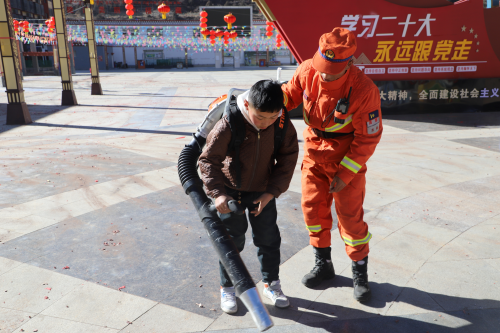 “右手握住握把,食指按在开关处,出风口对准火焰根部,左右来回扫动,利用强大的风力将火焰吹灭……”左贡县红旗广场,三级消防士德西占堆正在细心教导藏族小朋友如何使用斯蒂尔风力灭火机。