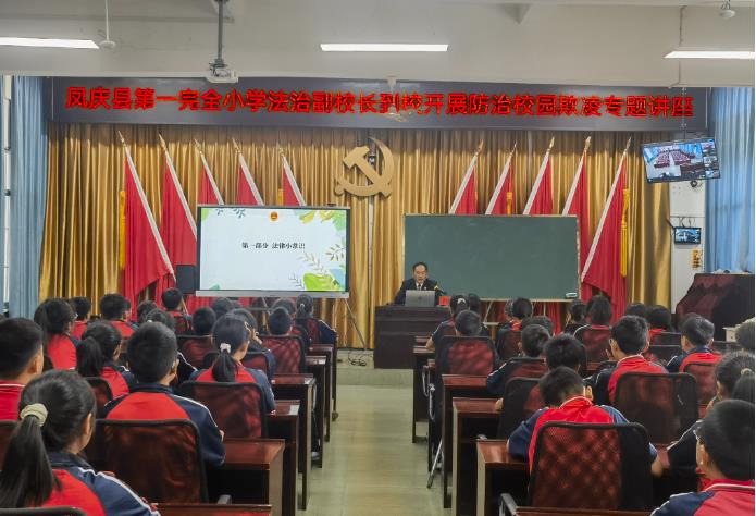 风筝有了线的约束,才能飞得更高;人有了法的约束,才能活的更好。法治教育要从娃娃抓起,为增强全校师生的法治意识,切实提高自我防范意识和安全防范能力,有效预防和消除学生校园欺凌的危害,保障学生身心健康和生命安全,维持正常的校园秩序,营造人人“学法、知法、懂法、守法、用法”的浓郁氛围,我校特别邀请学校法治副校长、凤庆县人民检察院副检察长洪继东同志,于2024年4月1日到校对全校师生开展防治校园欺凌专题讲座,讲座有效利用学校“1+N”设备,主会场设在学校大会议室,六(4)班和六(5)班学生到大会议室收听收看,其余各班通过链接在教室收听收看,实现了法治教育全覆盖。