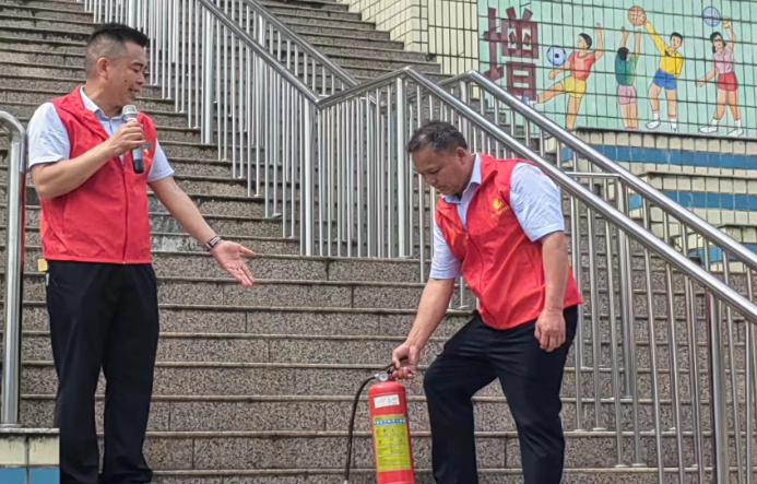 接着唐学同志向师生介绍了消防器材的使用方法和注意事项,并进行了现场操作演示,同时邀请了四位学生上场进行演练。