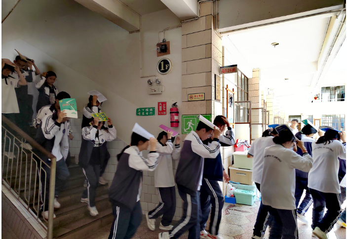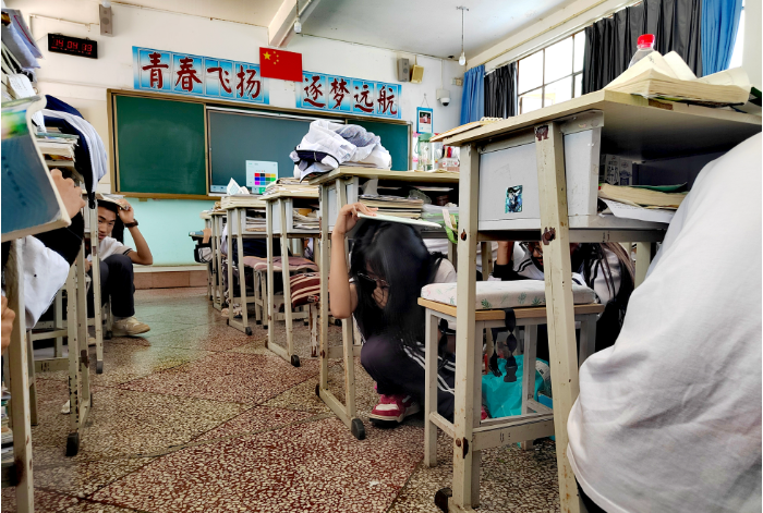 在之后的教学区的防震避震演练中,全体同学在当班任课教师的指挥和引导下,抱头闭眼,利用课桌等支撑物进行应急避险,并在主震过后由老师统一指挥,快速向各年级指定避险区域撤离。