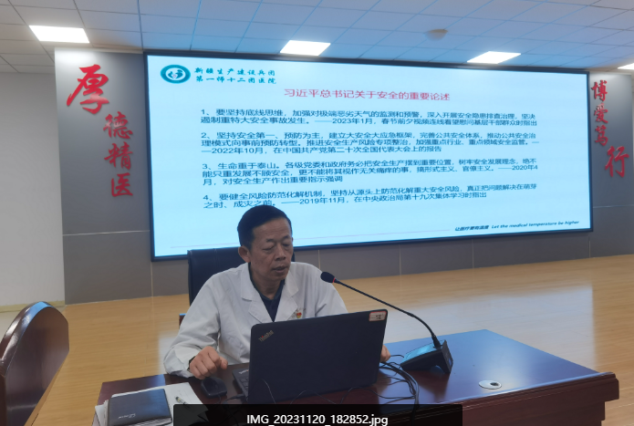 医疗安全是医疗卫生战线一个永恒的主题,提高医疗质量是医院永远的追求。医院党支部认真学习贯彻习近平总书记关于安全生产重要论述和重要指示批示精神,牢固树立“人民至上、生命至上”的安全发展理念,切实增强做好安全生产工作的政治责任感和历史使命感。以更高的标准、更严的要求,更实的举措,推动安全生产工作走深走实,让安全理念深入人心,争做公共安全的吹哨人。