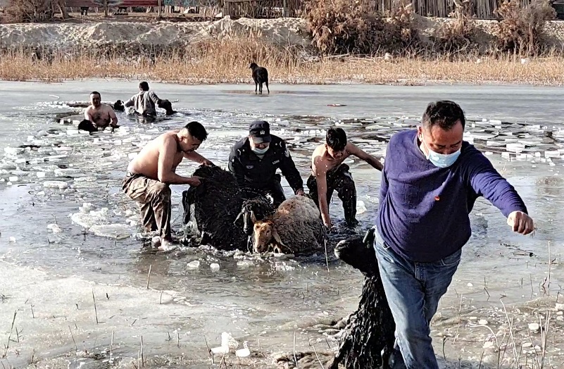 清风网讯(通讯员:窦明媛、王军涛)2021年2月18日下午17时许,在新疆沙雅县盖孜库木乡博斯坦村的胡杨林里,一群吃饱的羊群“走捷径”从冰面渡河回羊圈时,由于春暖冰酥,全部落入河中。正在走访的两名辅警循着羊群异常的斯叫声赶来救助,由于羊群已经掉进河里有一段时间,已经有几只羊精神倦怠,再加上冰面较宽,冰层有一定厚度,救援存在难度。一名辅警先跳入渠中破冰开路,为救援做准备,一名辅警迅速向村委会和周边群众求助。在众人齐心协力的救援下,不到半小时羊群便全部安全上岸。经了解羊群均无大碍,此次紧急救援帮助牧民挽回损失两万余元。