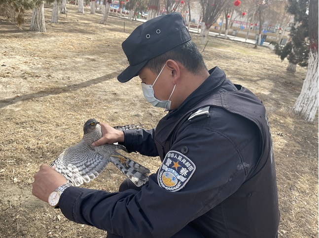 经了解,民警在沙雅县中心绿地广场开展日常巡逻时,发现草坪里一只飞禽不停的拍打着翅膀却无法起飞。因该鸟嘴爪尖利又很少见,民警便在一旁观察,并引导老人孩子不要靠近该鸟,以免受伤。经过观察,确认该鸟无法飞行后便将其抓住,经进一步检查也未发现明显外伤,民警便第一时间联系森林派出所。后经森林派出所民警鉴定,该鸟为国家二级保护动物红隼,因翅膀受伤无法飞行,只能待其恢复健康后放归大自然。