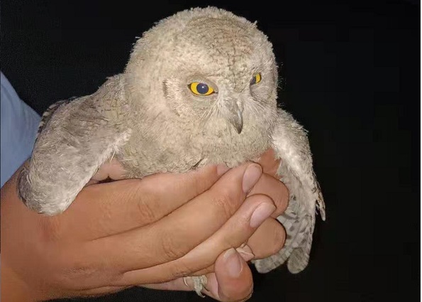 7月1日凌晨两点,沙雅县公安局托依堡派出所民警在开展夜间巡逻时,救助一只“呆萌”的国家二级保护动物短耳鸮幼崽。