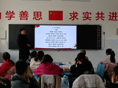 七年级1班道德与法治老师在“课前五分钟”环节带领学生回顾了毛泽东从湖南——井冈山——延安——西柏坡——北京的革命历程,与学生一起诵读毛泽东的著名诗篇《沁园春·长沙》以及1957年毛泽东在莫斯科会见中国留学生和实习生时的讲话选段,在诗词和讲话中感受毛泽东高瞻远瞩、大气磅礴的胸怀以及对青年人的殷殷嘱托和期盼。