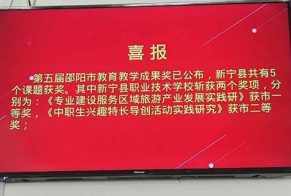 清风网讯(通讯员 肖乾勇 李双希) 5月21日,从新宁县职业技术学校获悉,该校课题《专业建设服务区域旅游产业发展实践研究》获第五届邵阳市教育教学成果一等奖,课题《中职生兴趣特长导创活动实践研究》获市二等奖。