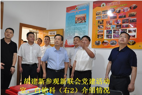胡建新一行参观了新联会党建活动室,听取了岳阳楼区委常委、统战部长白铭科、区新联会会长毛伟璋工作汇报,详细询问和了解新联会党建工作及在地方经济建设中发挥作用等情况。