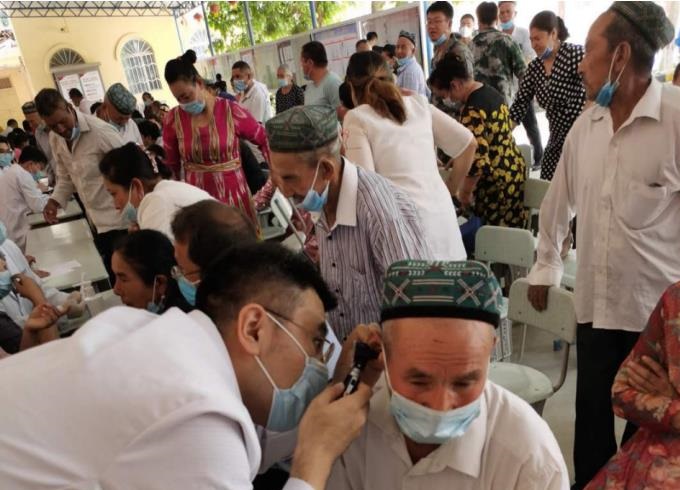 之后,13名北京援疆医生为村民进行了耳鼻喉、传染病、骨科、妇产科、神经外科、泌尿外科、儿科等方面的免费检查、诊治。在援疆医生到来之前,村里已经进行了大力宣传。义诊开始后,参加义诊的病人络绎不绝,面对热情的村民,医务人员迅速进入工作状态。义诊现场援疆医生认真检查村民的身体状况,耐心细致地为大家诊断病因、讲解医疗卫生知识,并认真地解答各种疑问,免费发放了药品。短短三个小时,70余名村民接受了义诊。