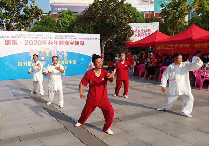 活动中,该市宋家塘街道办事处广场社区太极拳老年团队现场进行晨练表演。“现在国家强大了,老百姓的生活越来越好了,我们退休后也没什么事,随着生活水平的提高,健康意识也就越来越强了,我们这帮人基本上每天早上坚持在广场打太极,锻炼身体,比较注重保健养生。” 参与表演的刘兴中老人精神矍铄地说。