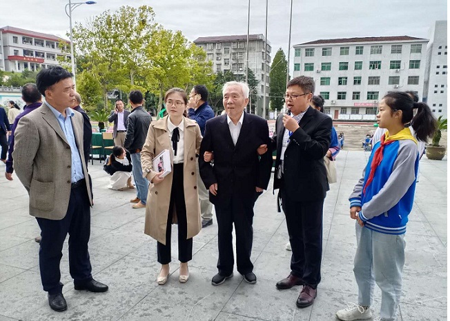 张金麟院士等参观了金铺中学的校园科技馆、毕昇活字印刷馆,以及“礼赞共和国、智慧新生活”主题科技展览,在校园科技馆张院士对学生手工制作仔细观察,不时点赞。在毕异活字印刷馆,张院士认真观看了辅导教师的印刷制作,当学生把由活字木模印出的“福如东海,寿比南山”八个大字送给张老时,张院士拱手表示感谢。在学校会议室,张金麟院士与学生代表、教师代表进行了一个多小时的座谈,张院士深情回顾了自己的求学时光和工作岁月。他说,他在河北农村读书时饱受日寇侵略中国的战乱之苦,心中暗暗发誓要让自己的祖国强大起来,于是发奋读书、立志报国。张院士拉着金铺中学副支书、副校长陈荣军的手说,“乡村学校一定要注重培养学生的爱国情怀和科学素养,要为学生的成长、成才奠定坚实的基础。在这方面,你们已经做得非常好,走在了其他学校前面,希望你们继续努力,为祖国培养更多人才。”