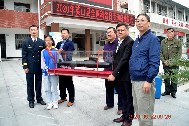 张金麟院士在启动仪式上向金铺中学亲授“科普基地学校”牌匾并赠送核潜艇模型。金铺中学校长陈雄飞向湖北省核学会回赠“情系乡村教育,共筑中华梦想”锦旗。湖北省核学会秘书长张军良向金铺中学致贺信。黄冈市科协胡建伟主席向金铺中学捐赠科普图书。英山县政府副县长郑伦福讲话并宣布科普日活动正式启动。县科协主席周思源主持启动仪式。
