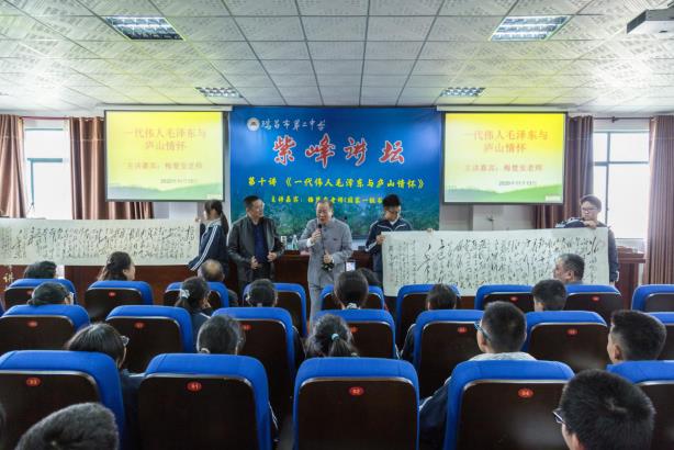 梅楚安以《一代伟人毛泽东与庐山的情怀》为题,向广大师生介绍了伟人毛泽东与庐山的情怀。随后,梅楚安向学校赠送自创的毛体书法作品《沁园春.雪》、《沁园春.长沙》,同学们和梅楚安齐声朗诵,现场气氛推向高潮。
