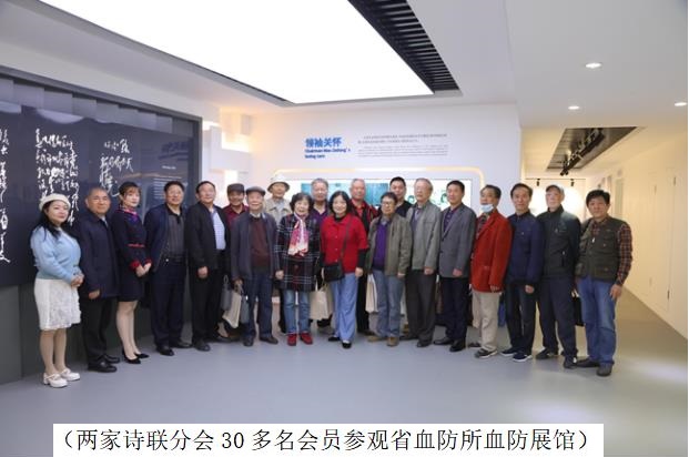 联谊活动中,板桥诗联分会党支部书记刘玉珍带领两家诗联分会30多名会员,先后参观了省血防所血防展馆和体检中心和岳阳楼区良万社区文化室。