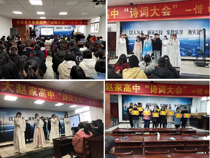 清风网讯(红安县大赵家高中:郑传兴)12月30日下午,红安县大赵家开展“诗词大会”——惜时劝学,旨在激发学生的读书兴趣和热情,培养学生对古诗词的热爱,创建良好的校园文化,营造浓郁的读书氛围,让他们在活动中沐浴文化的恩泽,接受传统的洗礼。