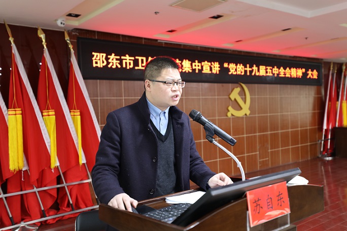 宣讲会指出,十九届五中全会精神是当前的一项重要政治任务,邵东市卫健系统在学习贯彻中要把握精神实质,确保学懂弄通做实;通过集中学习、三会一课、专家辅导等形式,抓好本单位党员干部多形式多层次全覆盖学习,原原本本学、全面系统学,着力在学懂弄通做实上下功夫,切实把思想和行动统一到全会的各项决策部署上来。要提升宣传实效,营造浓厚学习氛围。要利用微信公众号、院报、宣传栏、电子屏等平台宣传新精神;宣讲十九届五中全会精神要进科室、入病房。要开展学习分享会、交流讨论会、写心得体会、知识竞赛或者测试等一系列活动;通过广泛开展形式多样、丰富多彩、生动活泼的学习宣传活动,在全系统营造浓厚的氛围,将学习贯彻十九届五中全会精神推向高潮。要强化学以致用,推进健康邵东发展。坚持把学习贯彻五中全会精神和贯彻习近平总书记考察湖南重要讲话重要指示结合起来,紧密结合邵东卫健系统实际,科学研制好卫健系统“十四五”规划建议,全面盘点、统筹推进项目建设、健康扶贫、安全生产、公共卫生服务、家庭医生签约、中医药传承发展、疫情防控和党的建设各项工作,确保 “十四五”顺利开局,稳步推进健康邵东高质量发展。(王瑛)