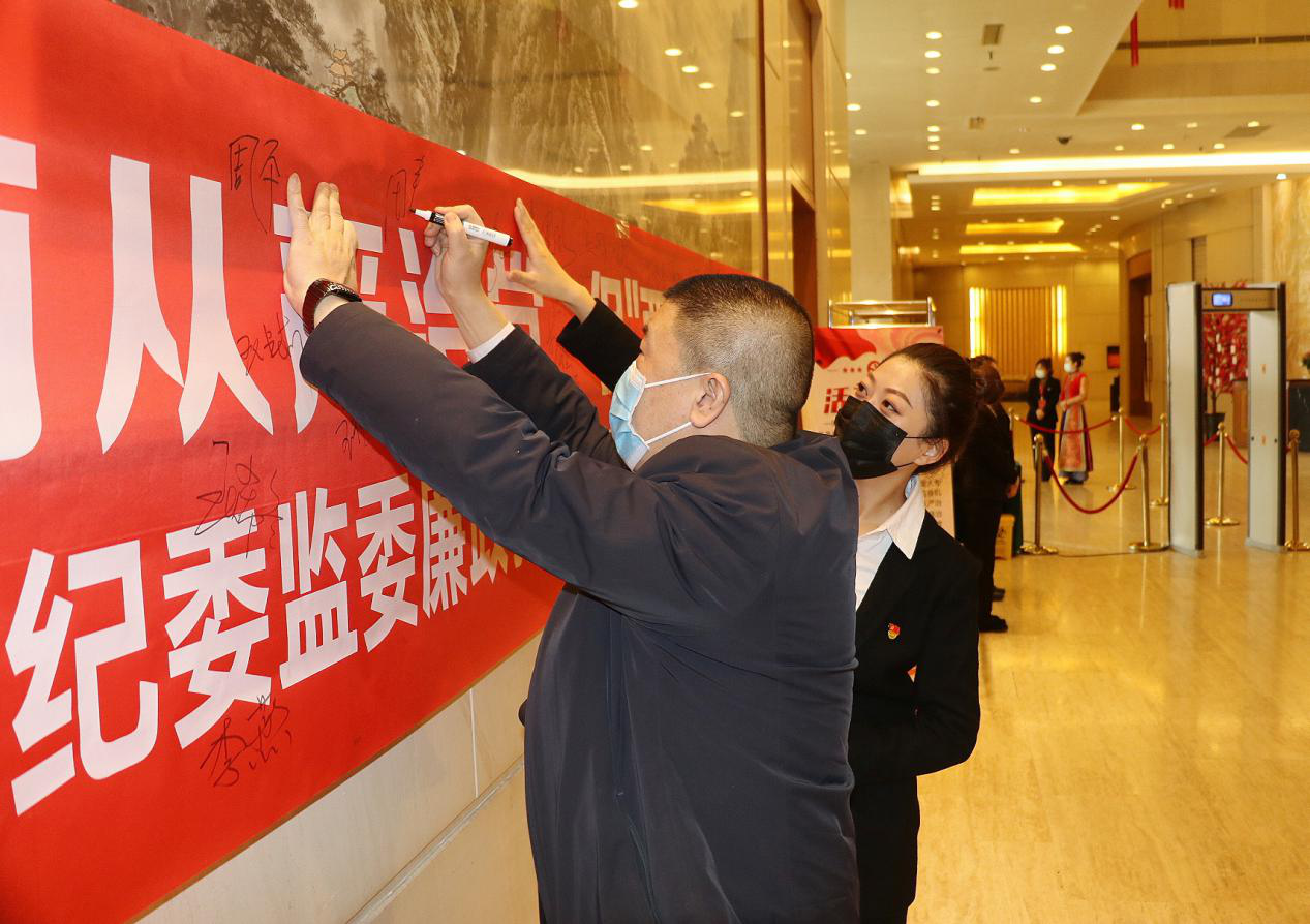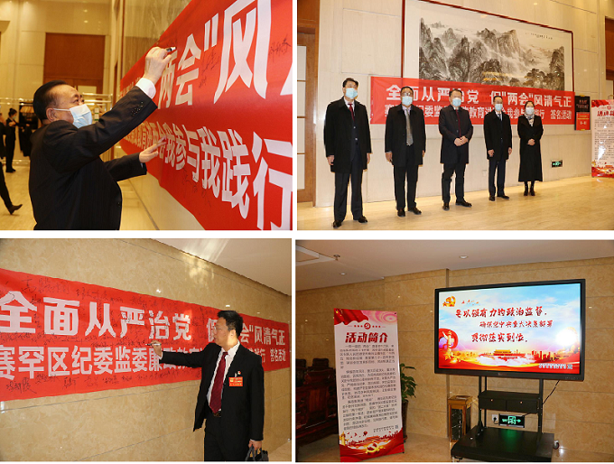 会场外醒目的标语紧扣廉政主题,传统而别有新意的“全面从严治党,促两会风清气正”倡议签名活动,代表、委员纷纷落笔签名,跃然舞动,力透纸背,承诺重千斤,再开廉政教育互动新风尚。每个会场外三台荧屏滚动播放的廉政常识、廉政金句、名人史话、习言习浯和发生在身边的警示教育片。观后如醍醐灌顶,明心见智;似春风化雨,让桃始芳,杏鼓蕾,柳渐绿,为“两会”增色,清风自来。每日适时推送代表、委员微信群的廉政知识,图文并茂,内容丰富,廉政文化,条理分明,赏心悦目。封闭管理中“零距离”浓厚代表、委员廉政学习氛围,为两会添彩,润物无声。