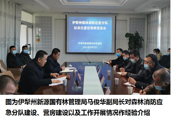 为进一步提高森林草原消防应急分队的规范化、专业化和现代化建设水平,切实增强队伍的战斗力和凝聚力,提升预防和处置森林草原火灾的综合能力,确保科学、迅速、有效地扑灭森林草原火灾,实现“打早、打小、打了”目的,有效保障人民群众生命财产和森林资源安全。2021年3月2日,伊犁州森林消防应急分队标准化建设现场观摩会在伊犁州新源国有林管理局召开。伊犁州新源国有林管理局指挥部领导和相关科室全体人员以及伊宁市、伊宁县、霍城县、察布查尔县、尼勒克县、昭苏县、巩留县、新源县等各县市林业和草原局负责森林草原防火领导和防火办相关工作人员参加了会议。