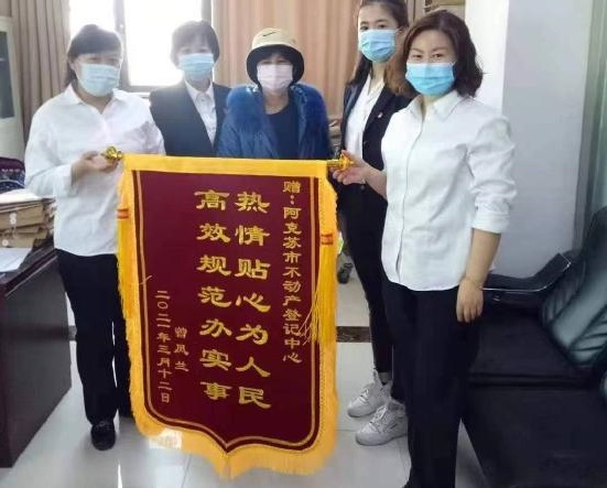 “金杯银杯,不如老百姓的口碑。”一面锦旗,是一份肯定和认可,更是一种责任和动力。不动产统一登记工作涉及千家万户,与人民群众的基本利益息息相关,不仅关系到人民群众对政府部门形象的塑造,还关系到整个社会的和谐与稳定。阿克苏市不动产登记中心将不断从日常的细微工作着手,秉持“我们乐于为您服务”的工作理念,继续做好全市不动产统一登记工作,用尽心,带给您便利,用尽责,带给您满意,确保人民群众的合法权益得到切实保障。