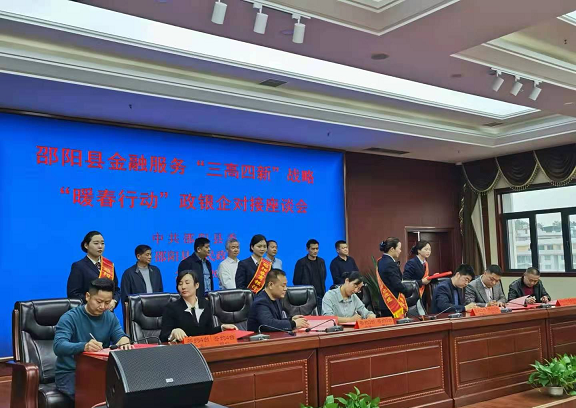 清风网讯(特约记者 钟鹏 通讯员 邓鑫) 3月26日下午,湖南邵阳县金融服务“三高四新”战略“暖春行动”政银企对接座谈会在昭阳农商银行总行11楼会议室盛大召开,该县县委书记蒋伟,县委常委、副县长周玉祥等县领导,县相关单位及各金融机构主要负责人,签约企业代表70余人参加了会议。