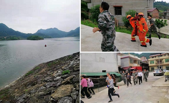 通过无人飞机侦察回传灾害事故现场情况,报告水库内侧出现塌坑现象,库外出现管涌现象;库内岛屿2人被困涉险、坝内1打渔村民落水;一地段发生山体滑坡,部分群众被洪水和山体滑坡围困,急需救助。指挥中心立刻启动“岛屿救援”及“水上救援”应急抢险预案,各部门配合有序。新邵县人武部民兵突击抢险队和尧虞塘水库应急分队迅速赶赴现场,肩扛一袋袋砂石,手持铁锹等工具向堤坝奔去,堵塌坑管涌;县综合应急救援大队人员立即驾驶水上舰艇向被困群众驶去,派出三只救生船转移被困群众,“遇险群众”及“险情”得到解除,县消防大队人员将“受困”和“落水”群众及时转移救治,在完成全部演练科目后,此次防汛抢险应急救援综合演练圆满结束。