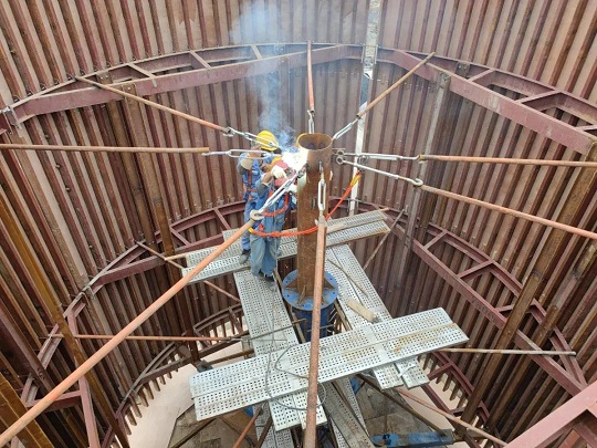 自中国十五冶阳新弘盛40万吨EPC总承包项目启动大干百天活动以来,现场施工频频传来捷报,各个子项混凝土浇筑顺利进行,多个子项设备安装陆续开工,现场施工进入达产达标前的关键时期。火法冶炼片区闪速熔炼炉、闪速吹炼炉的反应塔克服设计缺陷螺栓变更材料重新采购的时间延误,精心组织,不仅完成了原定的20圈反应塔安装任务,并超额完成全部共37圈反应塔的安装。硫酸片区尾气烟囱日夜倒班在保证回弹强度的前提下确保每周保底9模日均升高2.25米的工程进度,已顺利突破百米高度;净化工段玻璃钢作业易燃易爆,在安全第一的理念下,项目划定禁火、防火区域,严格落实作业票制度,作业方和玻璃钢施工方双专人监督,在安全可控的前提下抢抓进度,净化三塔玻璃钢直径7.5米乘7.7米,16吨一节筒体已顺利脱模。电解片区电解车间工程量大、涉及专业较多、工艺复杂、施工工期非常紧张,“大干100天”活动开展以来,项目部多次组织专题会议针对电解区域施工进度,制定详细的赶工措施,目前电解区域日均二百多人,屋面吊装、墙体砌筑、电解槽基础施工、行车安装等工作交叉作业正有条不紊的全面展开为接下来电解槽的进场安装做好了充分准备。精矿仓静压空心方桩共计5230根,截止到5月10日,累计完成3332根,已完成64%,两台静压桩机正不分昼夜的连续施工,正以日完成百根速度稳步前进。渣选片区精尾浓密车间53米浓密机和30米浓密机基础全部浇筑完成,为下一步的结构安装奠定了坚实的基础。