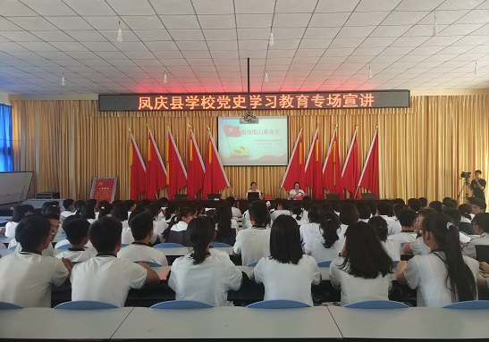 在凤庆县第一中学,开展学校党史学习教育宣讲活动。市委党史研究室四级调研员谌桂绚同志宣讲,学校教师及学生代表参加了宣讲活动。