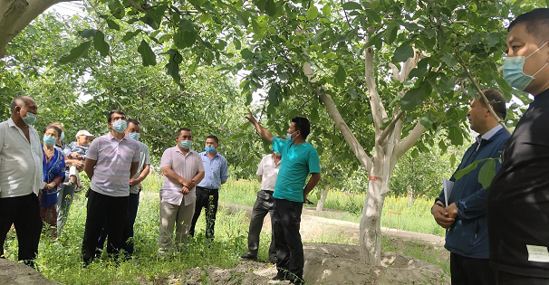 启动仪式结束后,林草局2名林果业专家围绕阿瓦提镇多浪社区特色产业的科技需求,通过集中培训、技术咨询及实地指导等方式,以核桃为例开展林果业实用技能培训,重点讲解施肥要点、注意事项和夏季修剪等管理技术。果农吾斯曼江·艾山聆听了专家阿里木江·阿布都克的讲解后兴奋的说:“我家种了好几年的核桃,虽然每年都修剪、施肥,但产量一直上不去,品质也不是很好,通过本次培训和现场指导,我学到了不少知识,也找到了产量不高的问题所在,今年我会在专家们的指导下,进行科学管理,对症下药,让我果园里的致富金树提质增收。”