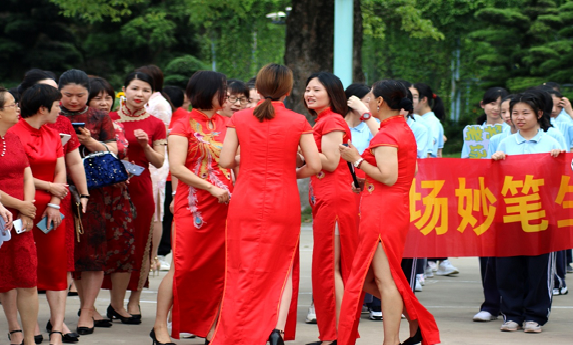九年磨剑试锋芒,父母助子盼功名。家长们有的穿着标有中考祝福语的红T恤,有的穿着“棋开得胜”寓意的旗袍,有的拉着一条条励志红幅,为孩子们加油打气。“参加中考壮行活动,我们比孩子还激动、兴奋,仿佛我们也回到了学生时代,同时我们更希望孩子们能感受到来自父母的鼓励。”几位904班的年轻妈妈说。