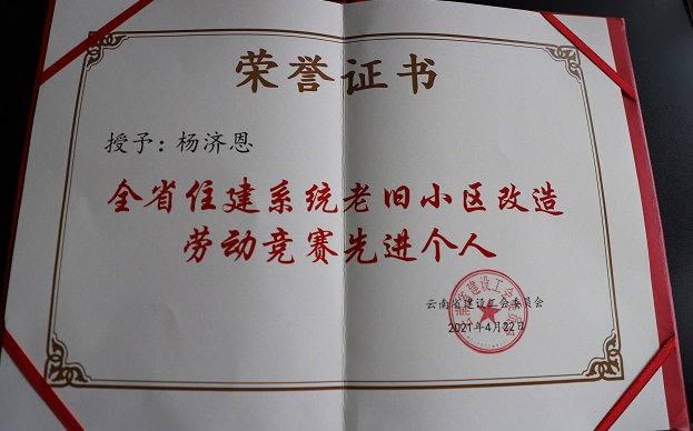 结合党史学习,突出为民办实事活动,凤庆县顺达建筑工程有限责任公司项目施工员于志华和云南百城建筑工程有限责任公司项目经理杨济恩二名同志在竞赛中迎难而上、奋力拼搏 ,与疫情斗争、与时间赛跑 ,全力狠抓进度,奋力创造一流 , 以“比、学、赶、超” 的热情和干劲 ,优质、高效完成老旧小区改造任务,近期获评云南省老旧小区改造劳动竞赛先进个人。
