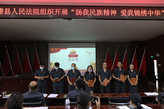 清风网讯(沙雅县人民法院:宋家欣)胸怀千秋伟业,恰是百年风华。今年是建党100周年,回顾我党百年波澜壮阔的历史和举世瞩目的成就,为进一步激发党员干警的爱国情怀和干事创业精神,近日,沙雅县人民法院以“扬我民族精神 爱我锦绣中华”为主题,围绕“唱歌曲、学模范、诵经典、谈感悟、送吉祥”五个环节开展道德讲堂活动。