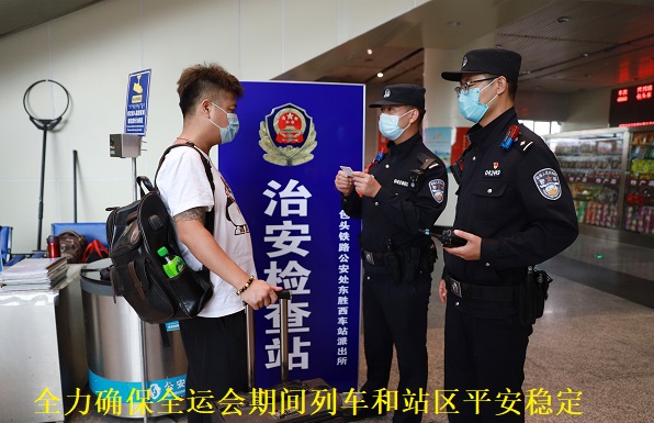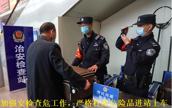 同时,全面加强对各类违禁品、危险品检查力度,督促铁路部门以最高标准落实安检查危措施,其中在鄂尔多斯火车站对进陕方向旅客实行二次安检、专区候车,在东胜西火车站采取分重点车次、重点时段对进陕方向旅客及其行李实施“全覆盖”安检,坚决杜绝危险物品进站上车,全力确保全运会期间列车和站区平安稳定。