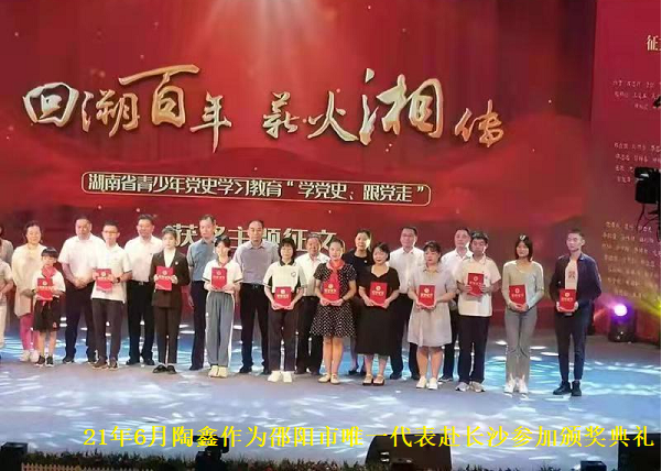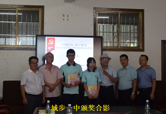 清风网讯(通讯员: 赵华)2021年9月28日,室外烈日炎炎,酷暑未消,城步一中行政会议室内却充满了如春暖意,湖南省青少年党史学习教育“学党史、跟党走”主题征文城步一中赛点颁奖典礼在这里高规格举行,城步县关工委主任、原城步县县长陈庭宪亲手把获奖作品集和奖金颁发给省一、三等奖获得者城步一中陶鑫和刘秉锐两位同学。