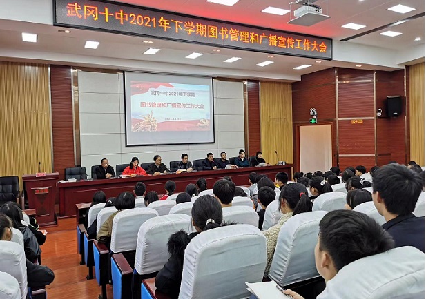 清风网讯(通讯员:徐利锋) 为深入推进文明城市创建工作,不断强化校园意识形态引领和文化阵地功能作用,进一步细化班级图书管理和提高校园广播宣传工作质量,11月2日下午,武冈十中在博闻楼学术报告厅隆重召开2021年下学期图书管理和广播宣传工作大会。会议由副校长周科华主持,学校团委书记肖本武、图书管理员、各班班长、学习委员和广播站全体成员参加会议。党总支书记、校长刘志军出席活动并作重要讲话。