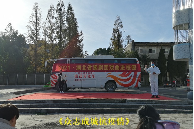 一首《再唱山歌给党听》将学生们带入到瑰丽的戏曲世界,主持人言简意赅地介绍了戏曲传承的重要性和必要性后,湖北省豫剧团的演员们先后表演了《经典咏流传》等经典唱段,尤其朗诵诗《众志成城抗疫情》歌颂出了白衣天使,公安干警、党员干部等在此次抗击疫情中奋力苦战与病毒厮杀面对疫情不畏艰难,顾大局识大体,舍小家顾大家,把风险留给自己的大无畏的精神品质,传递出了正能量,对学生们的触动很大。华丽的扮相、优美的唱词、圆润的唱腔、精湛的演技,赢得了观众们的阵阵喝彩。