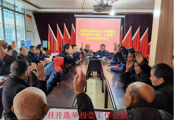 秀塘壮族乡1-17选区严格遵守人民代表选举投票工作要求,召开了选举工作投票会议,依法投票决定选出各选区总监票人1名,总计票人1名,监票人2名,计票人2名。