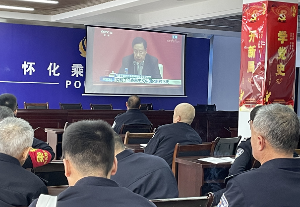 11月12日上午,中共中央举行新闻发布会,中央宣传部、中央党史文献研究院等有关部门领导向中外记者介绍十九届六中全会的有关情况。发布会开始前,怀化铁路公安处乘警支队党总支组织在家的支、大队领导和退乘在家的民警,在六楼大会议室通过投影直播全程收看了新闻发布会的实况。