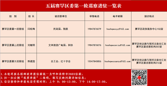 为方便干部群众反映情况,巡察组设立举报电话、信访信箱、电子邮箱及举报二维码,受理反映被巡察党组织领导班子及其成员、下一级党组织领导班子主要负责人和重要岗位干部问题的来信来电来访。对不属于巡察受理范围的信访问题,将按规定交由有关部门认真办理。(赛罕区委巡察办)