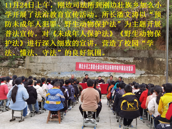 刚边司法所:11月24日上午,刚边司法所到刚边壮族乡加么小学开展了法治教育宣传活动。所长潘文涛以“预防未成年人犯罪、野生动物保护法”为主题开展普法宣传,对《未成年人保护法》《野生动物保护法》进行深入细致的宣讲,营造了校园“学法、懂法、守法”的良好氛围。