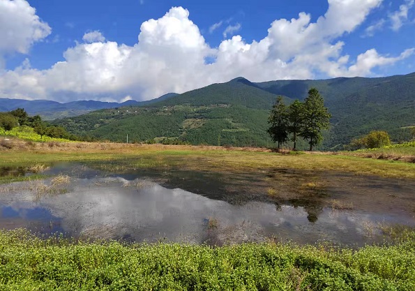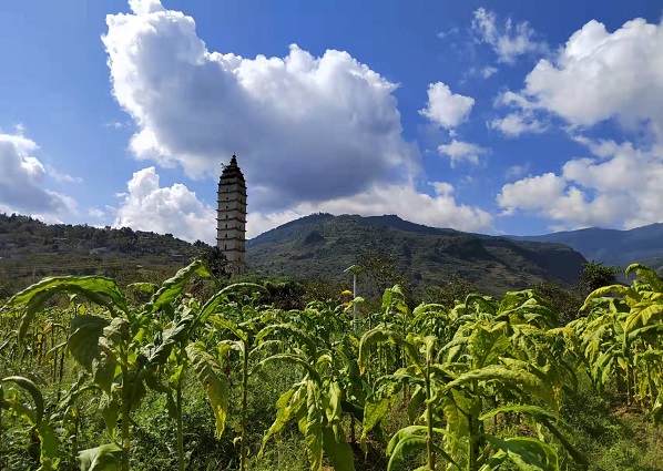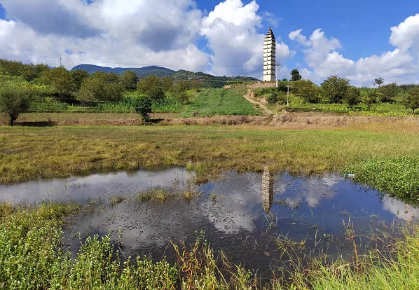 “圆池一砚多芳草,方纸千田横画轴”。玉砚塔旁为一圆池,状若砚台,故名为玉砚池。池边多生芳草,柳条垂于其上,鸟语花香,青翠欲滴,仿佛是用翡翠雕琢而成的一方砚台。池中常有清水,幽凉干净,是山间之清泉,涓涓流入,汇集而成。池水清澈见底,时而有鱼儿跃出水面。微风拂过,碧波荡漾间,白塔倒影摇曳生姿,宛若天上的神祇执笔蘸“墨”,准备书写美妙的人间画卷。玉砚塔周围,有良田千亩,农夫四季劳作,春苗青葱,夏禾悠悠,秋色焜焜,冬有白霜,像是一幅绘就在“纸”上美妙、灵动的四季田园画卷。