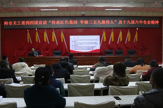 清风网讯(四团文体广电服务中心: 慕进军)12月22日,师市关工委宣讲团成员、师市关工委常务副主任武玲玲,师市党委党校原副校长赵勇赴四团开展学习宣传“传承红色基因•争做三五九旅传人”党的十九届六中全会精神专题宣讲会,引导广大党员干部群众把思想和行动统一到全会精神上来,推动全团兴起学习宣传贯彻党的十九届六中全会精神的热潮。四团党委副书记、团长张学军主持宣讲会,机关科室中心负责人,连队、社区老党员,老干部,职工,居民代表聆听宣讲。