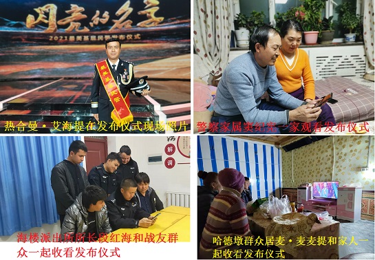 沙雅县哈德墩镇居民居麦•麦麦提在收看发布仪式后激动地说:“热合曼•艾海提当选“最美基层民警”我们都为他感到高兴和骄傲。今天我们全家人早早就守在电视机前,看到他熟悉的面孔,我们忍不住想起他平时为我们服务的点点滴滴。”