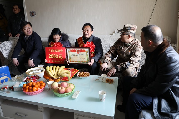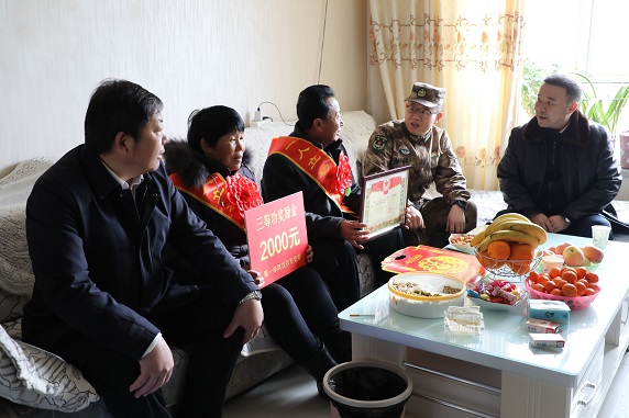 清风网讯(二团文体广电服务中心 :陈健生)1月18日,新疆生产建设兵团第一师人武部政委曹卓带领慰问组一行来到二团,将现役军人谢实龙荣立“三等功”的喜报送到其父母谢尚东、杨公英手上,向他们致以亲切的问候和军人的敬礼,大力弘扬拥军优属、拥政爱民优良传统,增强军人及家属的荣誉感、自豪感和获得感。