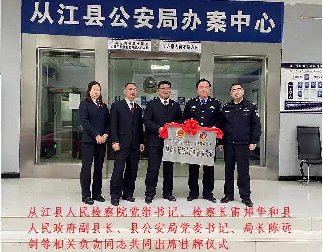 清风网讯(从江县人民检察院第一检察部:龙江桃)为强化侦查监督,发挥检警协作效能,推动从江县公安局执法和从江县人民检察院监督的规范化水平进一步提升。1月24日,从江县人民检察院与从江县公安局共同设立的侦查监督与协作配合办公室正式挂牌成立,县人民政府副县长、县公安局党委书记、局长陈远剑和县检察院党组书记、检察长雷邦华等相关负责同志共同出席挂牌仪式。