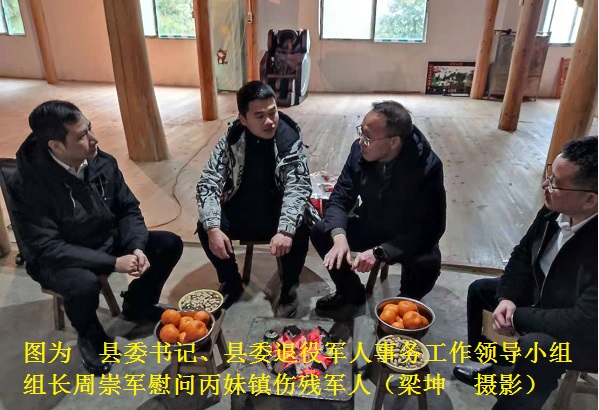 清风网讯(从江县退役军人事务局:鲁畅、陆华超、潘文军)为扎实做好2022年春节期间全县拥军优属工作,进一步巩固和加强军政军民团结。从江县在虎年春节来临之际,开展丰富多彩的走访慰问驻军和优抚对象活动。从江县委书记、县委退役军人事务工作领导小组组长周崇军,县人大常委会主任欧仁文,县政协主席孟荣林分别率慰问团,顶着严寒细雨,承载全县人民的深深情意深入县人武部、武警县中队、县消防救援大队及20个乡镇(街道)开展春节走访慰问驻军和优抚对象活动,向驻从部队官兵、消防救援指战员和广大军烈属、伤残军人、军队离退休干部、复员退伍军人致以新春的祝福和诚挚的慰问。