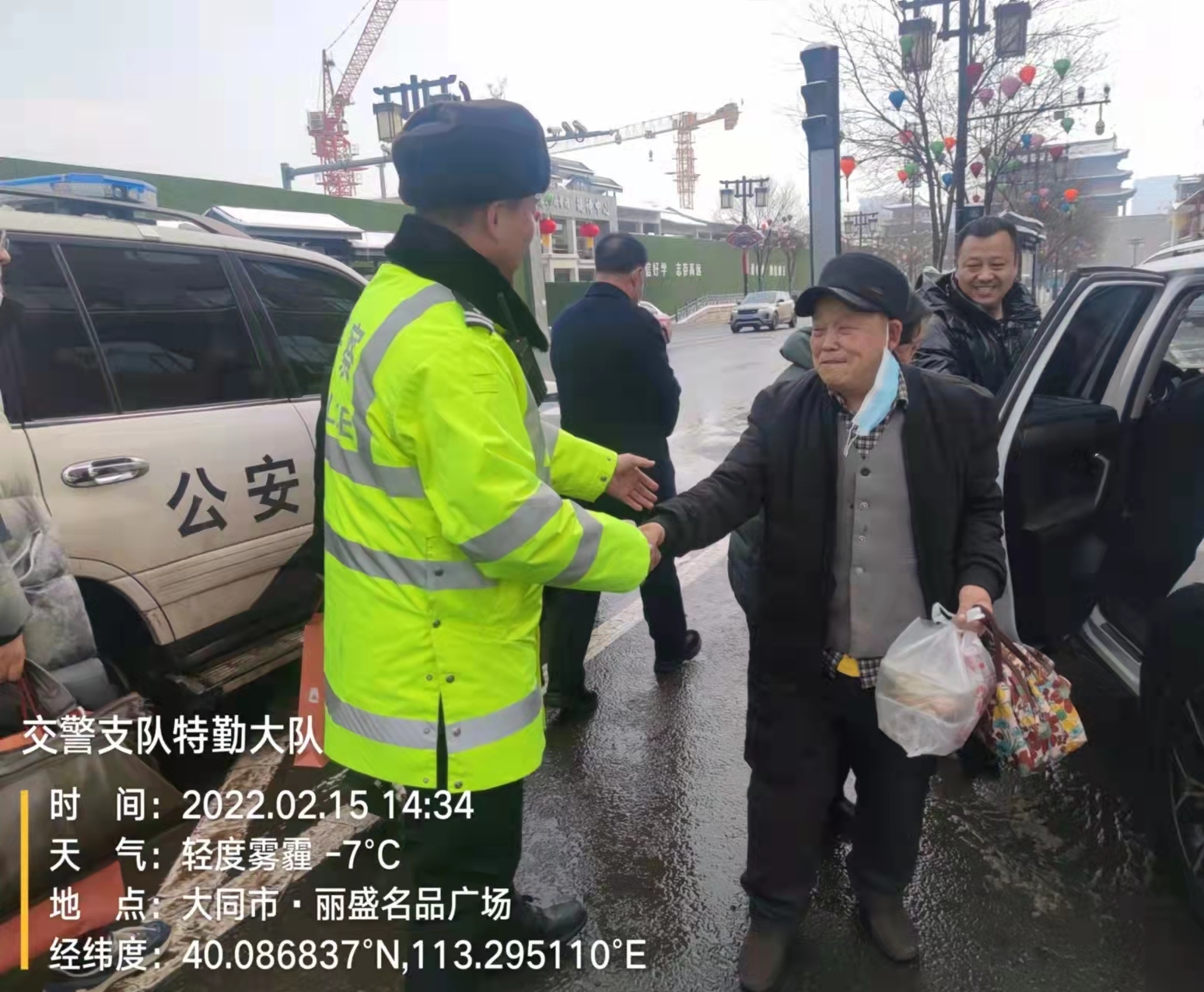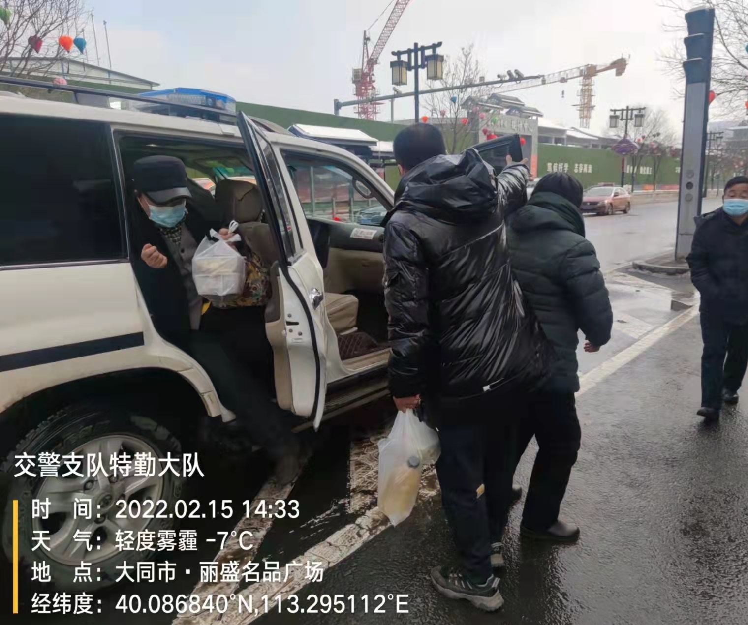 2月15日,山西省大同市公安局交警支队特勤大队民警在元宵节古城游街表演交通管制时,热心帮助了一名求助群众。